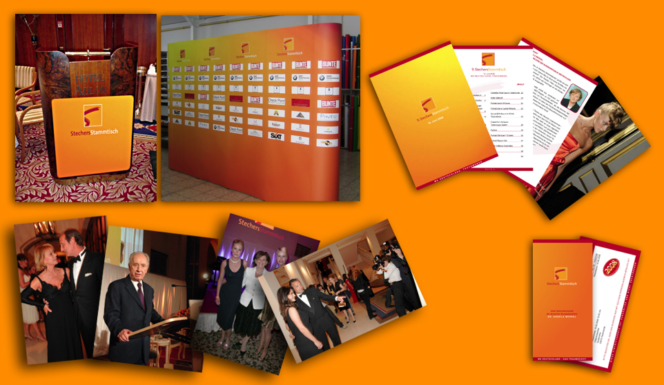 Konzeption, Umsetzung verschiedener Werbemaßnahmen zum Event „Stechers Stammtisch“: Entwicklung CI, Einladung, Save the date, Eintrittskarten, Programmhefte, Postergalerie, Aufsteller, Menükarten, Anzeigen, Fahnen, Tischkarten, Rednerpult, Spendenzettel, Schilder, etc. |