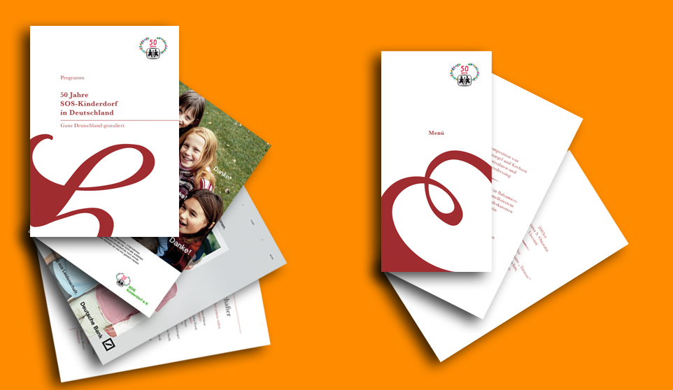 Konzeption, Design und Produktion von Einladungskarten, Menükarten und Programmheften für die Veranstaltung "50 Jahre SOS-Kinderdorf" |